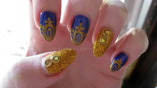 I've done this design so often I could probably do it in my sleep by now.. but hey, it never gets old. This was my first time trying it with acrylic paints instead of polish. And I only did two accents instead of a full set because I was damn tired.. I'm getting so lazy in my 'old' age, lol.